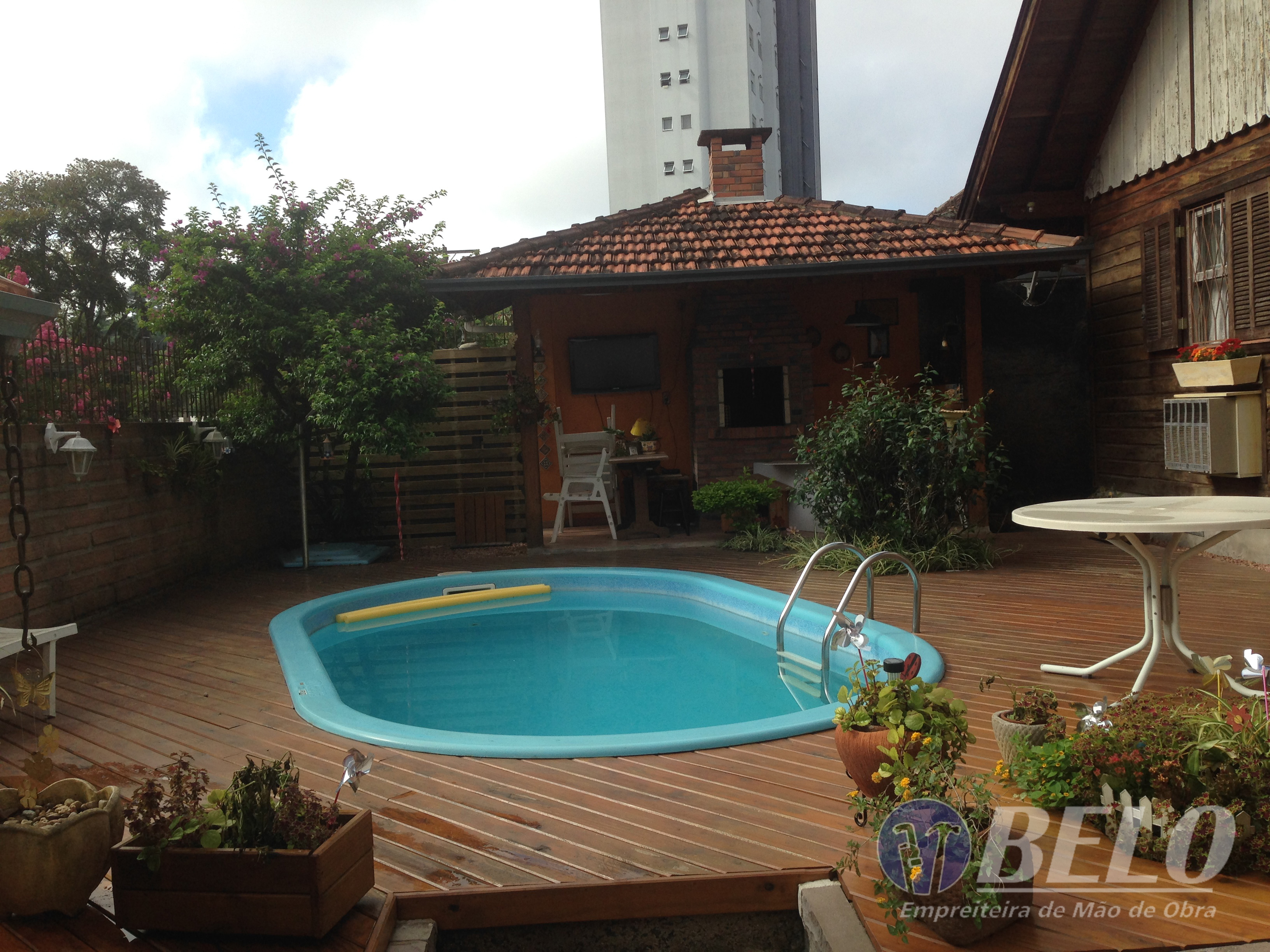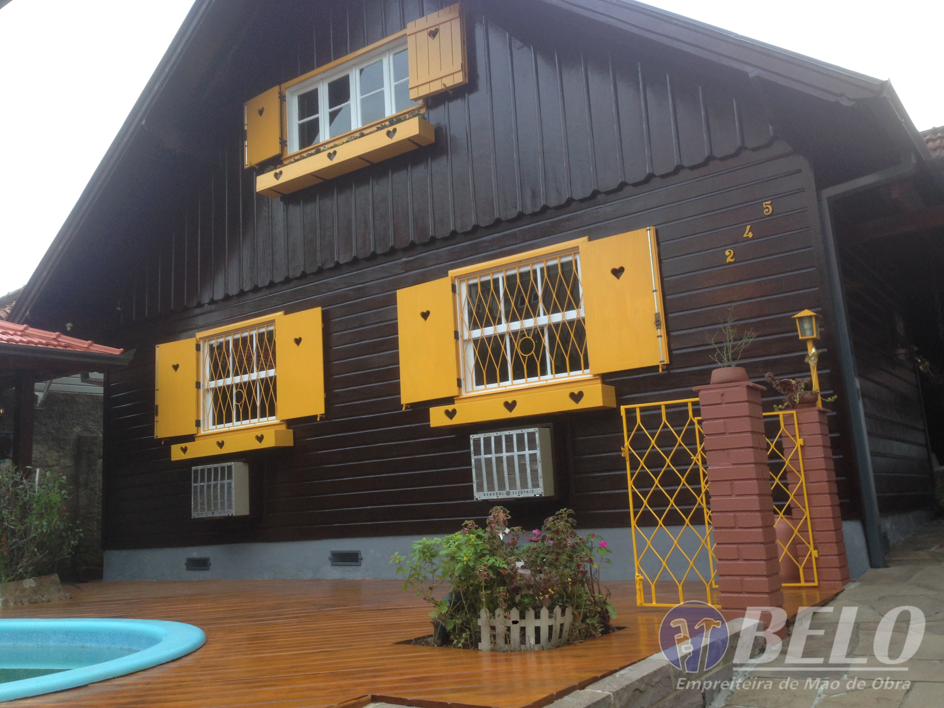 Também foram confeccionadas novas folhas venezianas e floreiras com detalhes em coração, fortalecendo assim ainda mais o estilo da residência. Realizada também a lixação e pintura do deck de madeira ao redor da piscina, juntamente com montagem de deck e janela na parede dos fundos, decorando assim uma parede inutilizada, ainda foram feitas as pinturas das grades, do portão e de determinadas partes do telhado .