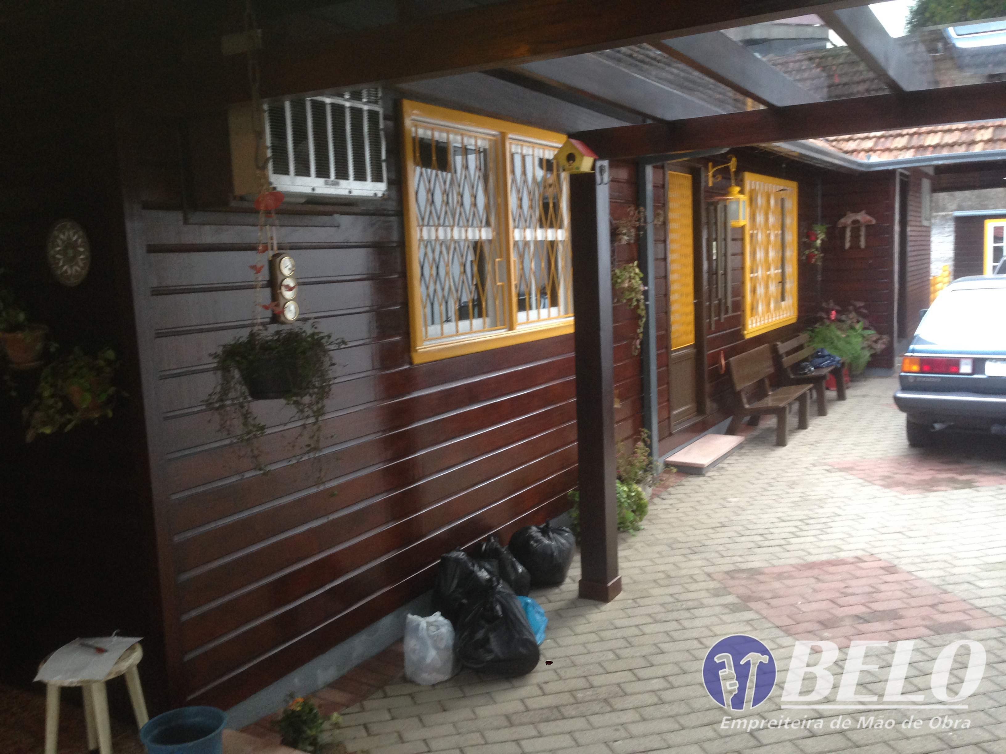 Referindo-se a uma casa de estilo alemão, construída em 1961, encontrava-se sem nenhuma manutenção feita à algum tempo. O cliente optou por manter o desing antigo, porém dando um toque de modernidade com a escolha da tinta à base d'água em tom de imbuia, também dando aquele charme nas janelas e floreiras em amarelo ferrari.