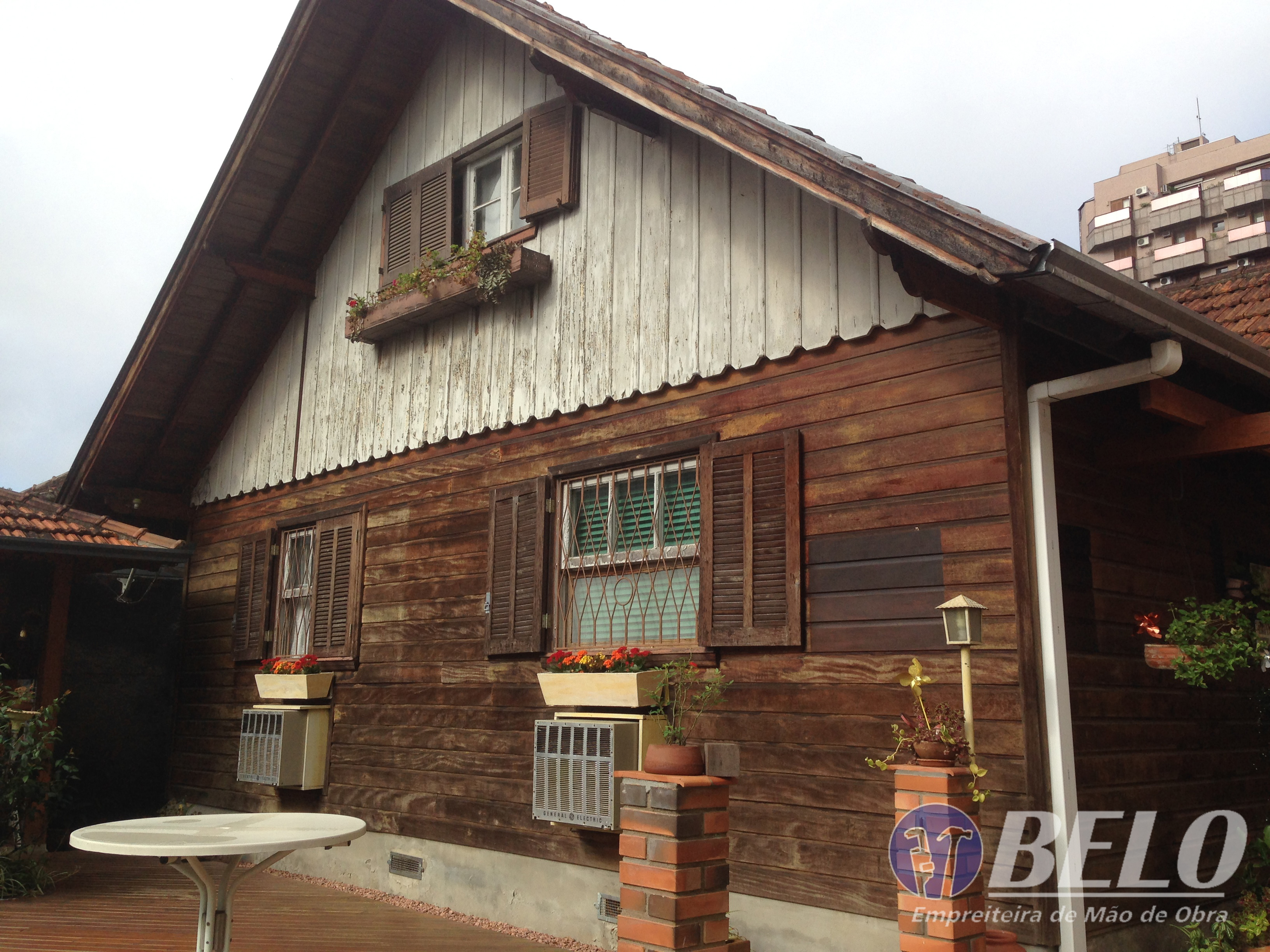 Referindo-se a uma casa de estilo alemão, construída em 1961, encontrava-se sem nenhuma manutenção feita à algum tempo. O cliente optou por manter o desing antigo, porém dando um toque de modernidade com a escolha da tinta à base d'água em tom de imbuia, também dando aquele charme nas janelas e floreiras em amarelo ferrari.