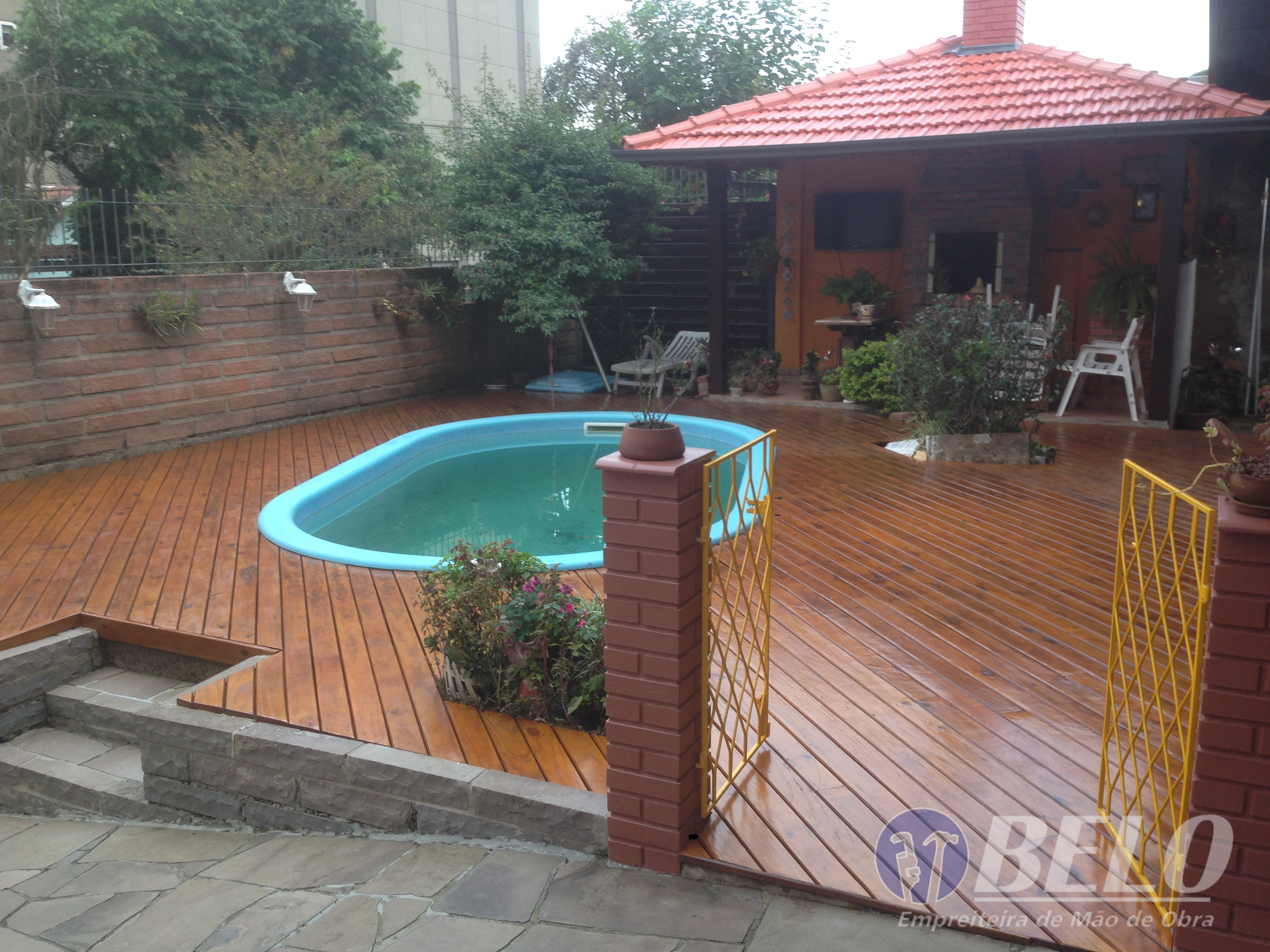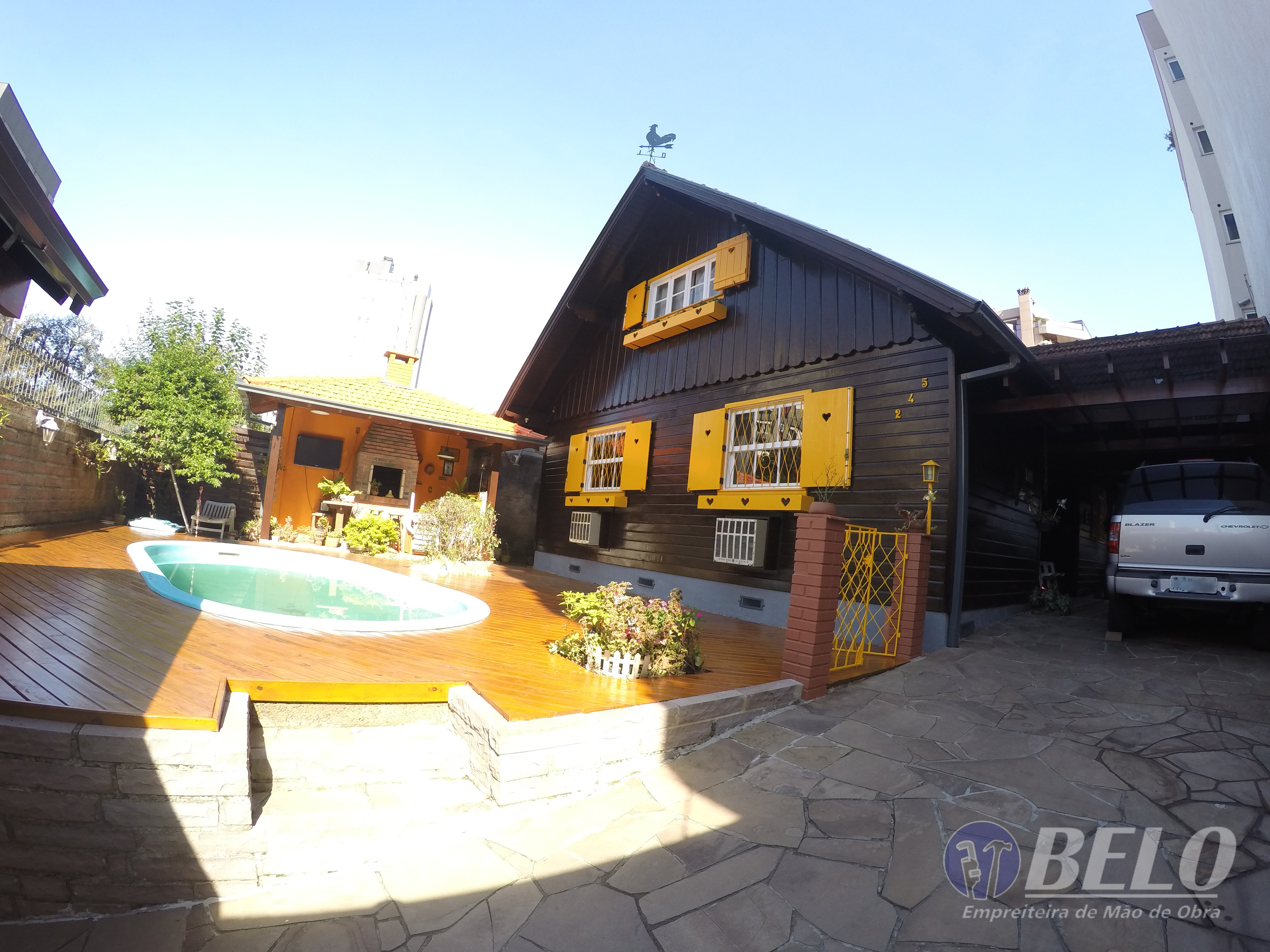 Também foram confeccionadas novas folhas venezianas e floreiras com detalhes em coração, fortalecendo assim ainda mais o estilo da residência. Realizada também a lixação e pintura do deck de madeira ao redor da piscina, juntamente com montagem de deck e janela na parede dos fundos, decorando assim uma parede inutilizada, ainda foram feitas as pinturas das grades, do portão e de determinadas partes do telhado .